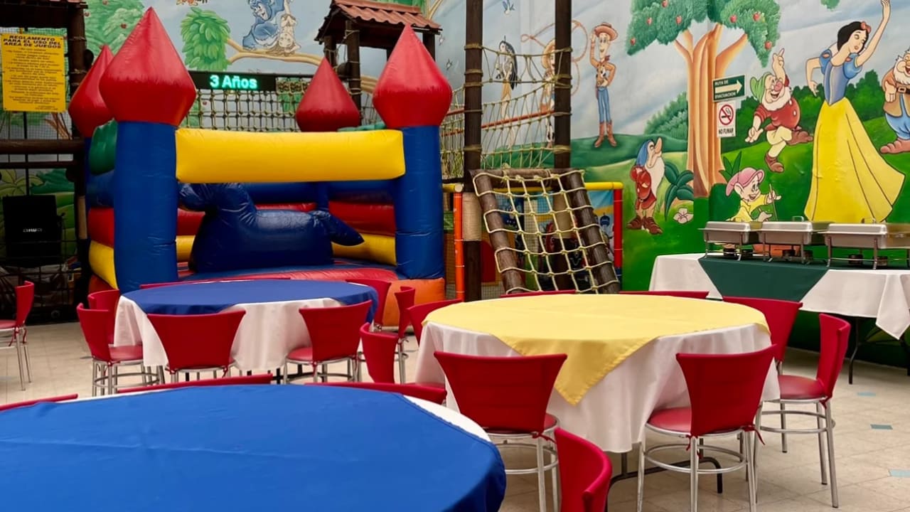 Salón de fiestas infantiles con capacidad para 120 personas, ideal para celebraciones dinámicas. Incluye eventos de 5 horas con música infantil y animadora, ofreciendo una experiencia divertida, organizada y completa para niños y familias.